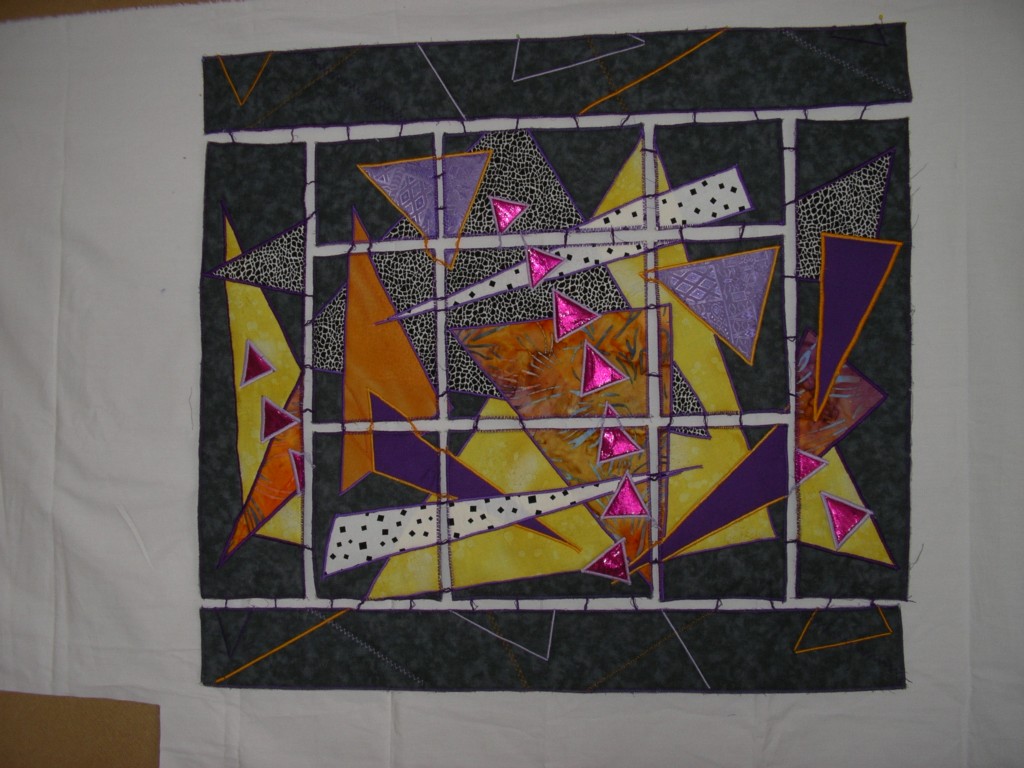 Nadat de top klaar was heb ik hem in stukken gesneden en toen met soluvlies erachter de stukken met tussenruimte weer aan elkaar genaaid, later het soluvlies opgelost. Het was een vrij bewerkelijke quilt, maar het resultaat is wel leuk geworden.