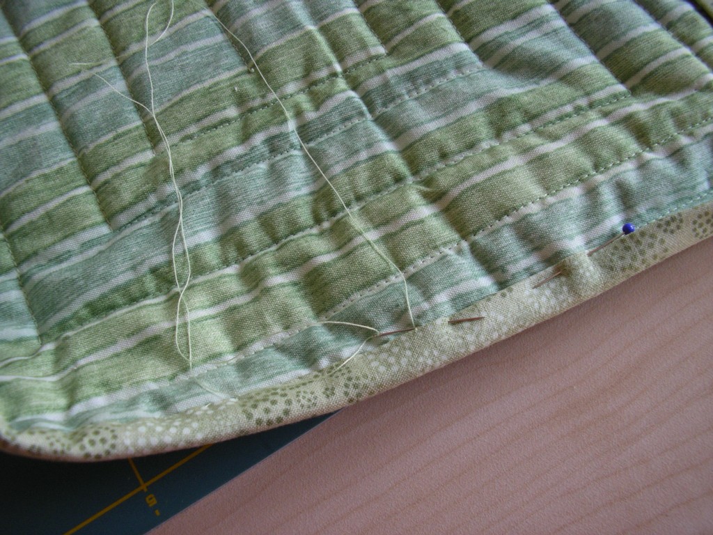 Verder ben ik bezig de blauwgroene quilt om te biezen, lekker in de zon eraan zitten werken: