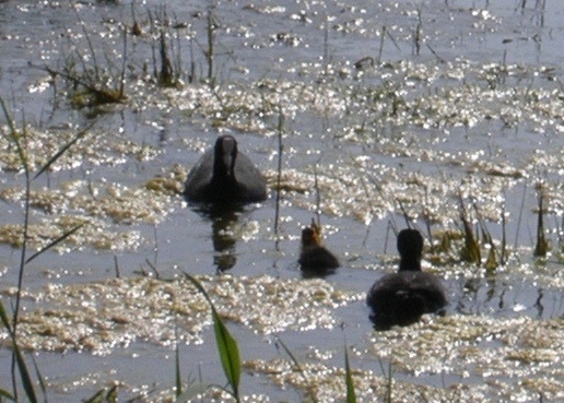 Gisteravond zag ik de eenden weer rondzwemmen, helaas zonder jongen, maar ze werden al gauw weggejaagd door de meerkoet. Die is nog steeds druk bezig het kleintje te voeren.