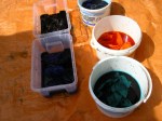 Allemaal prachtige namen voor verschillende verfkleuren. We hebben ook nog barnsteen gebruikt en woestijnroos. Eerst wat lapjes in de verfoplossing en na een tijdje weer wat stof er bovenop zodat je wat lichtere tinten krijgt. Het bovenste groene lapje heb ik gemaakt door een fel geel lapje opnieuw te verven met paarsblauw.