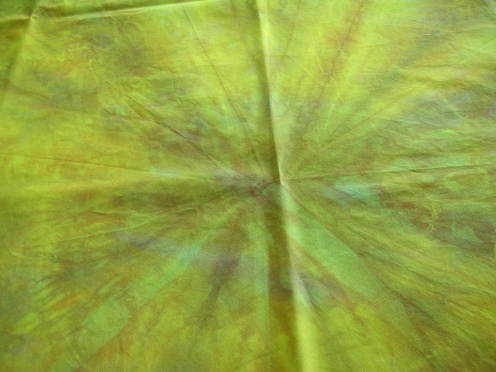 Hiervoor heb ik een gele lap genomen die ik een vorige keer had geverfd, deze vanuit het midden samengebonden met elastiekjes. Hier nog een paar resultaten: