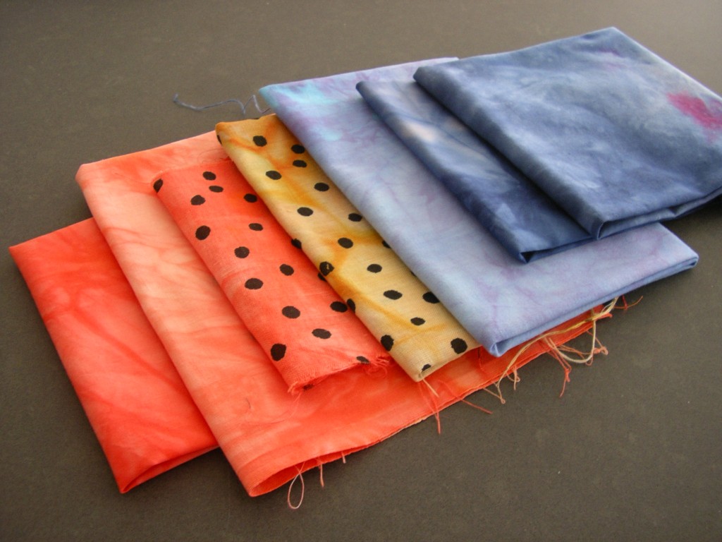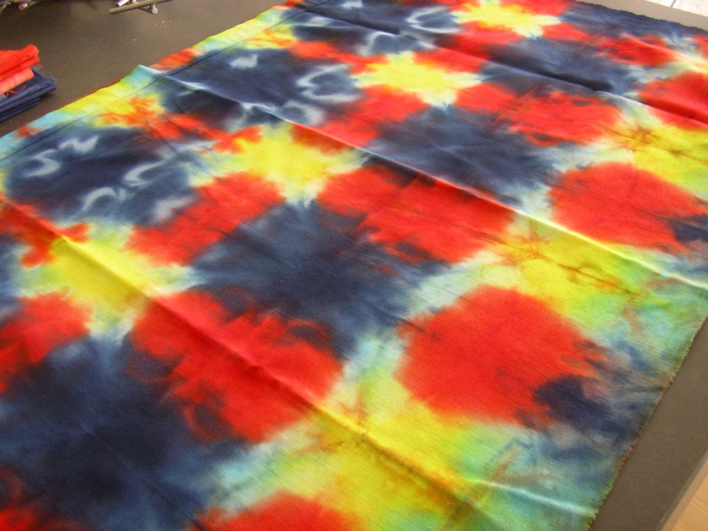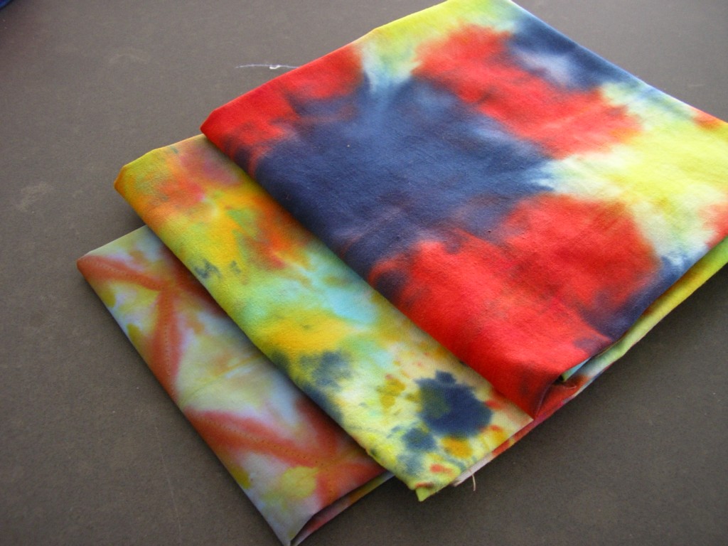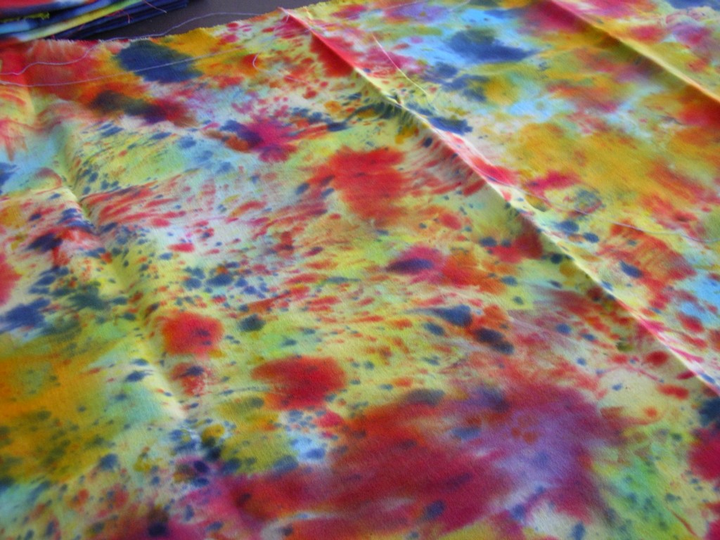 De laatste lapjes vind ik wel erg bont geworden, bij deze heb ik een lap harmonicagewijs als driehoek gevouwen en daarna de punten 1 voor 1 in een andere kleur gedoopt: