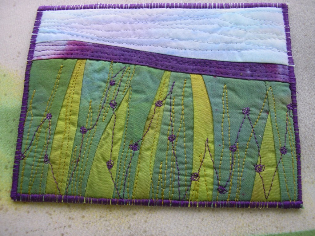 De kaart is machinaal gequilt. Vandaag regent het, dus kan ik nog een poosje oefenen.