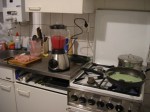 Gisteren zijn we Martijn zijn nieuwe onderkomen in Amsterdam wezen bekijken, het ziet er leuk uit, hij heeft alles geschilderd en zelf laminaat en zeil gelegd. Eindelijk een keuken en badkamer voor hemzelf alleen! Aat heeft geholpen met gordijnen ophangen en Yvonne heeft heerlijk Indiaas voor ons gekookt, het zag er mooi gekleurd uit met groene masala en een rode bietendip. De blender die hij voor zijn verjaardag had gekregen kwam goed van pas. Natuurlijk had ik voor hem ook pannenlappen gemaakt.