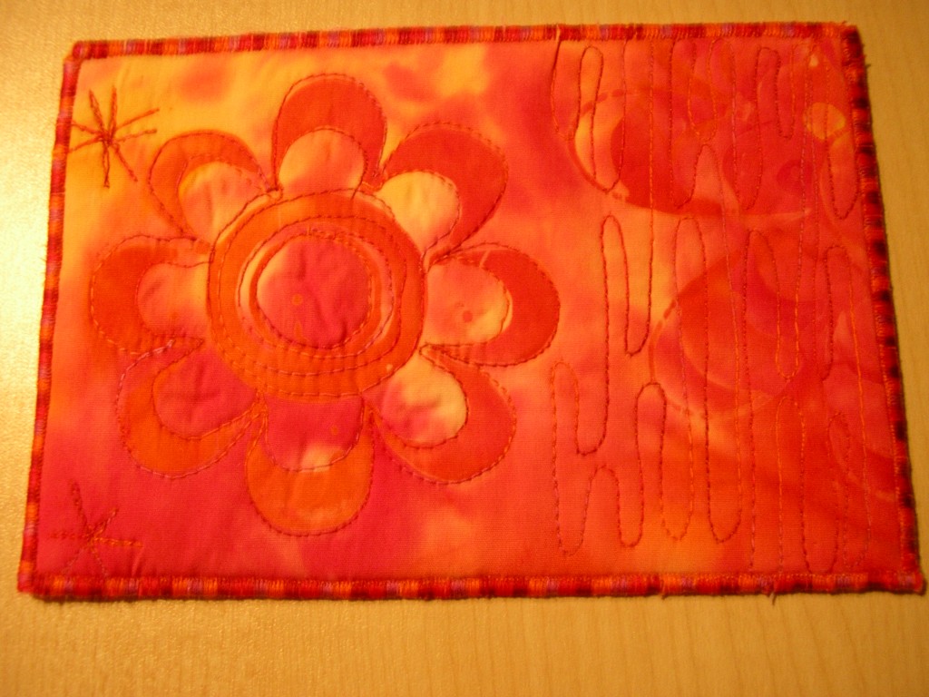 Het was vandaag zulk prachtig weer dat we er natuurlijk op uit moesten. We hebben heerlijk gewandeld bij Herkingen, maar toen ik thuis kwam kon ik het niet laten om nog even achter de naaimachine te gaan zitten. Deze kaart is het resultaat, in werkelijkheid is hij wat minder fel oranje van kleur, meer roze: