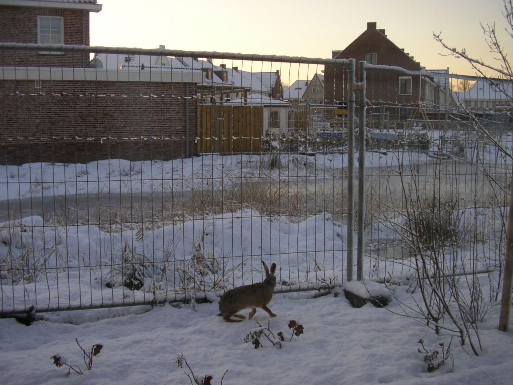 Vanmorgen onder het ontbijt keek ik naar buiten en zag daar een haasje in de tuin:
