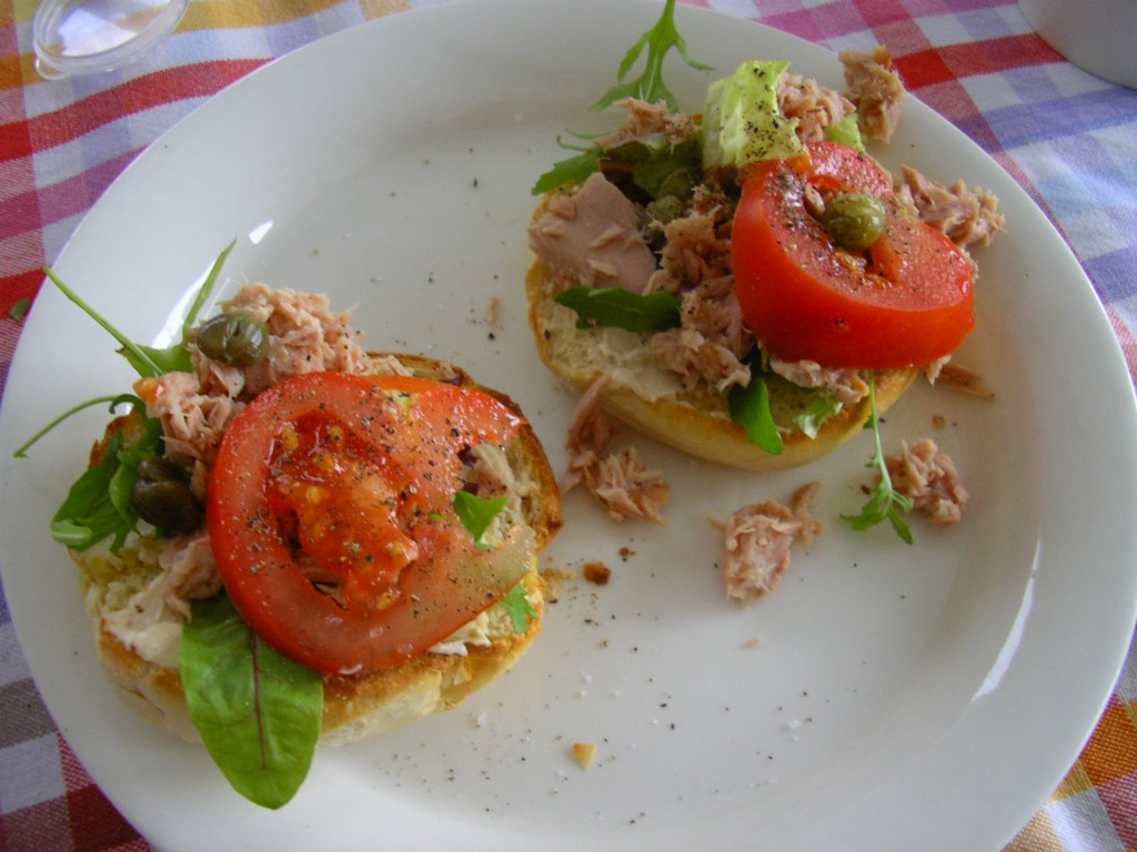 Je besmeert de beide helften met humus en legt er daarna wat rucola of andere sla op, tonijn uit blik, kappertjes en plakjes tomaat. Zout en peper erover en een beetje citroensap. Een heerlijk lunchgerecht.