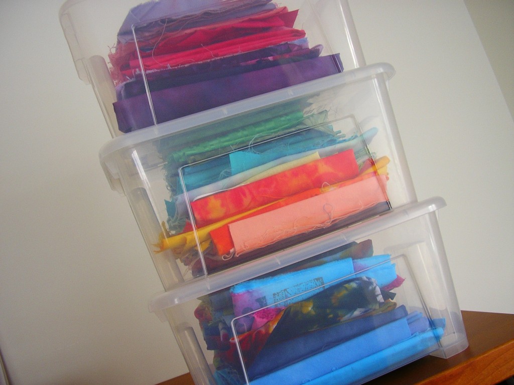 Nu we hier alweer langer dan een jaar wonen is het tijd om mijn hobbykamer eens met kritische ogen te bekijken. Sommige dingen kunnen anders en beter! Ik ben begonnen om al mijn zelfgeverfde lapjes in plastic containers te doen, dan hoef ik niet steeds zo te zoeken.
