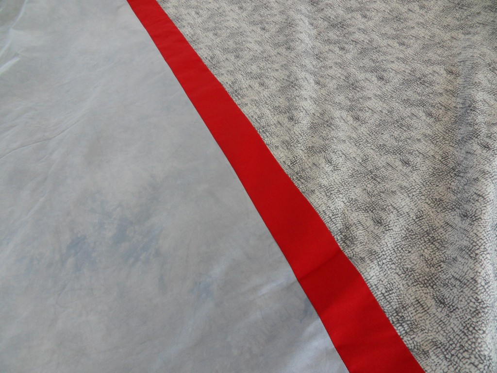 Omdat ik niet genoeg “olifantenstof” (zie berichtjes van 10 en 17 maart) voor de achterkant had heb ik een wit laken gekocht bij de Hema en dit grijs geverfd. Met een rode tussenbaan heb ik de verschillende stoffen aan elkaar genaaid en zo is de achterkant groot genoeg: