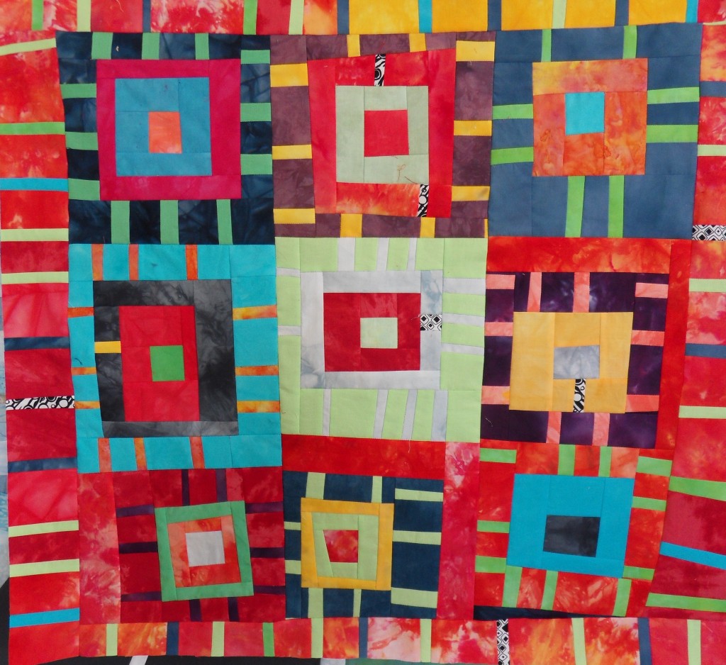 Ik heb het idee van Melody Johnson, die heeft heel veel leuke quilts gemaakt in felle kleuren. De meeste stoffen heb ik zelf geverfd.