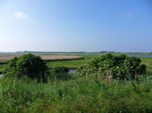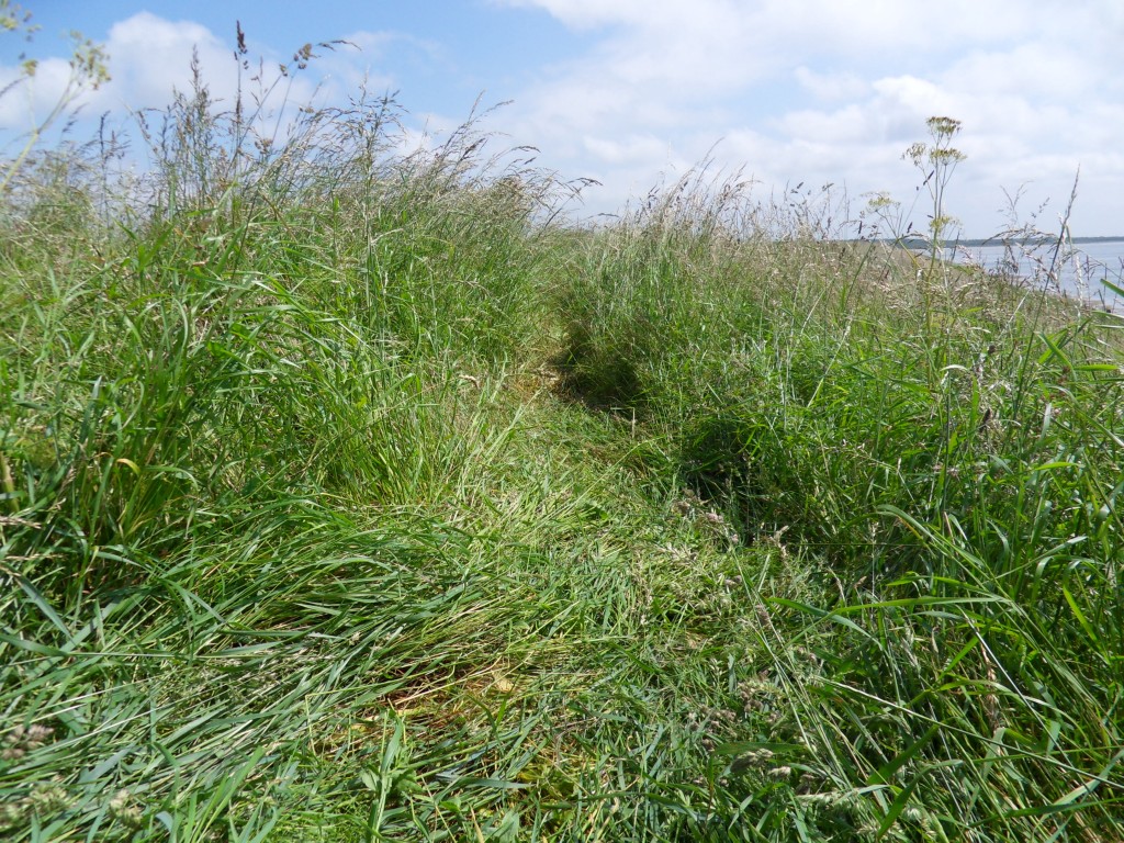 In Goedereede liep de route langs ons oude huis, waarna we bij de Gouden Leeuw op het terras een bakje hebben gedaan. Inmiddels hadden we van onze afritsbroeken korte broeken gemaakt, maar later had ik daar wel spijt van. We moesten nl. een heel stuk over dijken lopen met hoog gras: