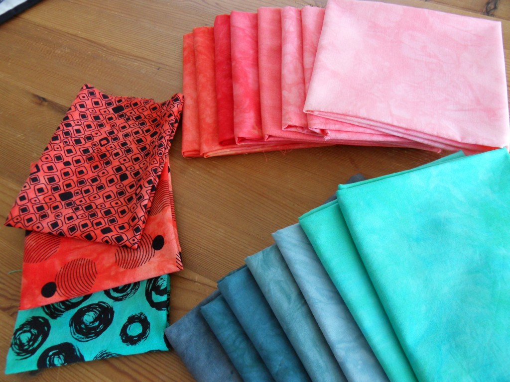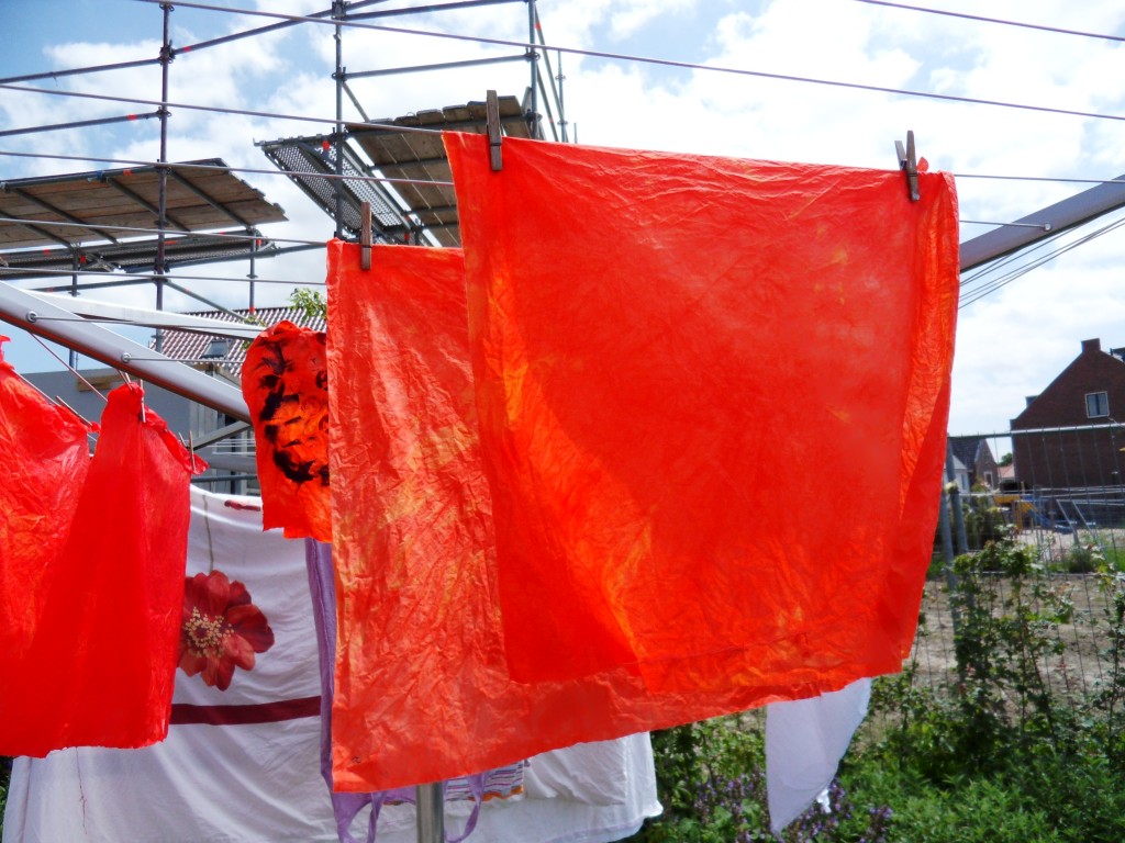 Terwijl iedereen voor de buis zat was ik lekker buiten lapjes aan het verven. Ik heb allerlei tinten groen en oranje en rood geverfd, een kwestie van de verfoplossing steeds verder verdunnen, zo krijg je een mooie reeks. Ook heb ik wat restjes zwartwitte stof in het verfbad gestopt. Vanmiddag alles uitgespoeld en met die harde wind was het snel droog.