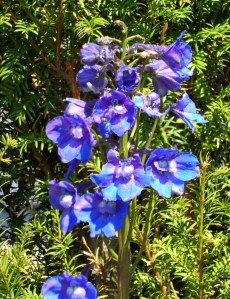 De ridderspoor doet het geweldig, hij staat gelukkig op een plekje uit de wind, anders zou hij allang omver gewaaid zijn.
