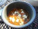 Als avondeten hadden we linzensoep met stokbrood. Daarbij hadden we een gemarineerd geitenkaasje. Hiervoor had ik gisteren al een geitenkaasje in vieren gesneden, elk deel in een plakje rauwe ham gewikkeld en dit in een glazen pot overgoten met olijfolie. Een paar takjes rozemarijn en wat gepelde teentjes knoflook erbij en voilà, dit smaakte vandaag heerlijk bij de soep. De olie kan je gebruiken om vlees in te smeren e.d.