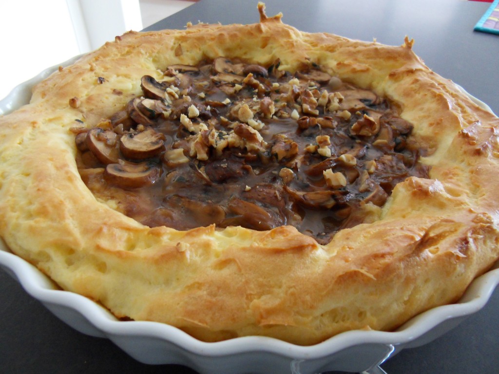 Verwarm de oven voor op 200°. Verhit voor de vulling de olie in een koekenpan en fruit hierin de ui op laag vuur tot ze zacht is. Voeg de champignons en knoflook toe en bak even mee. Laat vervolgens de bloem 1 minuut al roerend meepruttelen. Voeg nu geleidelijk de bouillon toe en breng alles al roerend aan de kook. Laat het even inkoken. Houd 2 eetlepels walnoten apart en roer de rest met de peterselie door het paddenstoelenmengsel. Maak op smaak met peper en zout. Schep het mengsel in het midden van de vorm en bestrooi met de resterende walnoten. Bak de gougère 40 minuten in de oven, tot deze gerezen en goudbruin is.