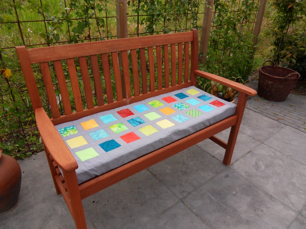 We hebben pas een nieuw tuinbankje gekocht en daar heb ik dit kussen voor gemaakt:
