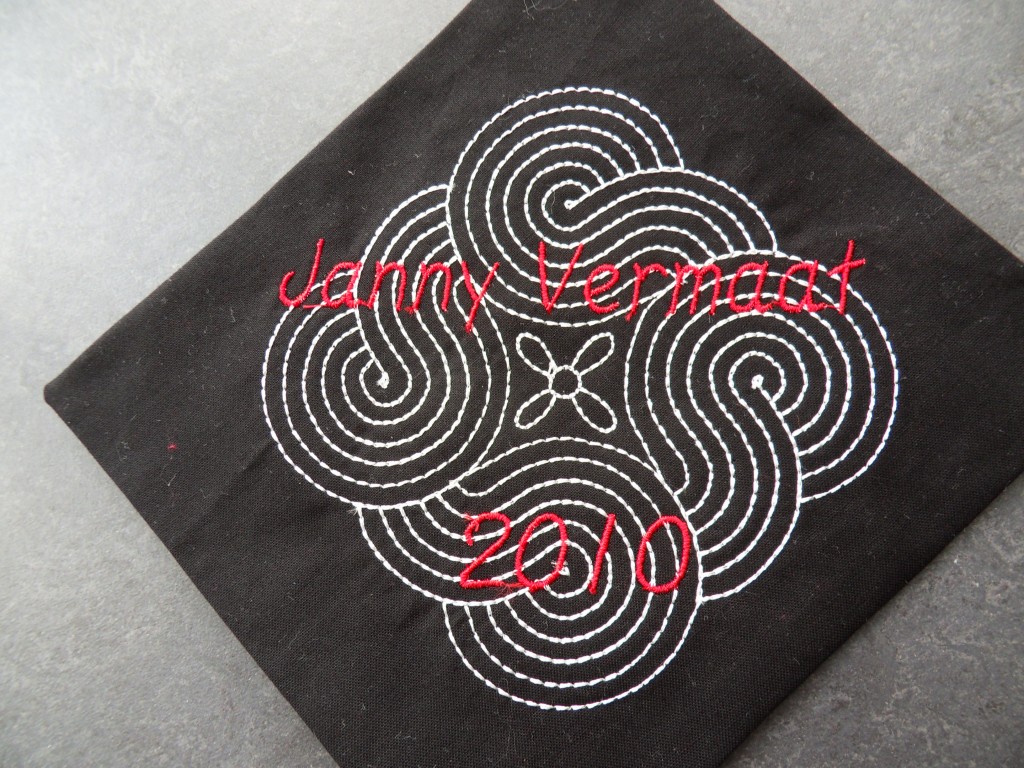 Martijn is dit jaar afgestudeerd en morgen gaan we naar de diploma-uitreiking in Amsterdam. Zijn quilt kan ik dan gelijk meenemen, want die is af! Marianne heeft nog een bijpassend label gemaakt op de borduurmachine: In totaal heb ik meer dan 300 spiralen gequilt, waarbij ik meer dan 1000 meter quiltgaren heb gebruikt.
