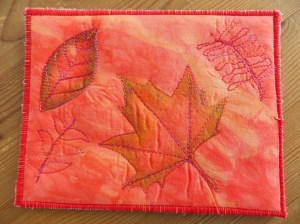 Ik heb van freezerpaper wat malletjes geknipt en met paintsticks de randen gekleurd, hiervoor heb ik blauw met geel gemengd, verder met free motion quilten de contouren gequilt. De achtergrond is een zelfgeverfd lapje. Een echte herfstkaart.
