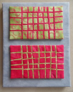 Ik heb de lapjes nog diverse malen doorgesneden om er smalle strookjes tussen te zetten. Het resultaat vond ik best leuk geworden, maar wat doe je er nu mee? Ik had nog een canvas schildersdoek liggen, hier heb ik lichtgrijze stof opgespannen. Van de twee lapjes heb ik twee kleine quiltjes gemaakt van 11 x 18 cm en deze op de grijze stof bevestigd.
