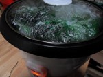 De verf heeft warmte nodig, ’s zomers kan het lekker buiten in de zon, maar nu is dat een beetje lastig en aangezien de rijkstkoker op 40 of 45 graden blijft heb je veel minder tijd nodig.