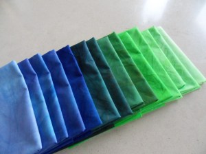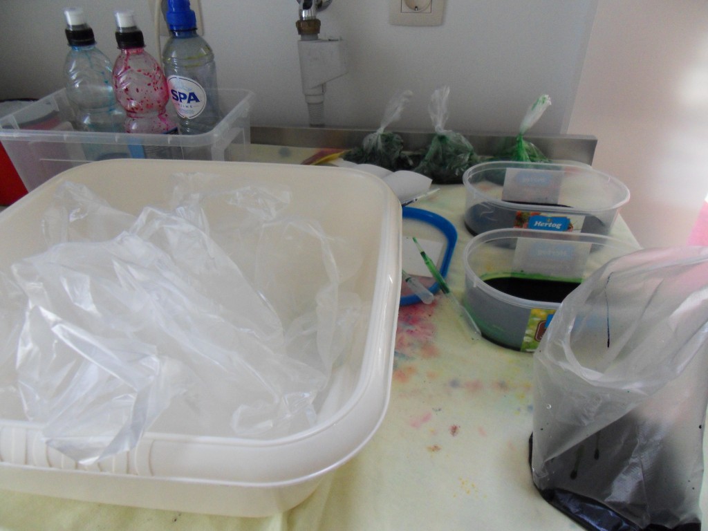 Op het weblog van Nienke las ik over verven met de rijstkoker. Marianne bracht er vorige week 1 voor me mee en zaterdag kwam de bestelde verf van Stof tot verven, zodat ik het gelijk kon uitproberen. Ik heb van kleur naar kleur geverfd en de beide hoofdkleuren ook verdund, zodat je een mooie serie krijgt. Je doet eerst soda-oplossing + verfoplossing in een plastic zakje en voegt daar een lapje stof aan toe. Alle zakjes gaan in de rijstkoker en die heb ik zo’n 5 uur op de warmhoudstand laten staan, daarna in de pan af laten koelen en toen uitgespoeld. Een uitgebreide handleiding kan je lezen op de site van Nienke (verfvirus).