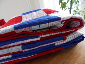De twee quiltjes die ik in opdracht gemaakt heb van gedragen overhemden zijn af. Ze zijn 1.05 x 1.05 geworden. Ik heb het blauw en rood toegevoegd en waar ik bij de ene quilt rood gebruikt heb heb ik bij de andere blauw gebruikt en andersom. Bij de rode bies heb ik een stukje blauw tussengevoegd en bij de blauwe bies een stukje rood. Het zijn twee vrolijke quiltjes geworden.