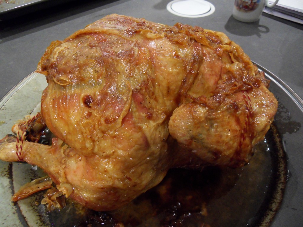 Voor het hoofdgerecht hadden we een mesthaan van 3,5 kg, die uren in de oven had gestaan, hij smaakte prima!