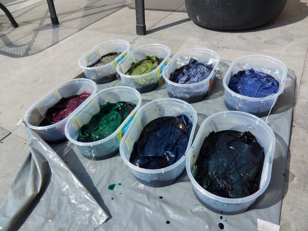 Wat kun je met zulk mooi weer nou beter doen dan verven, nou ja er zijn natuurlijk meer dingen te verzinnen zoals lekker in de zon zitten, maar het is ook fijn om de verf te laten intrekken door de zonnewarmte i.p.v. met de rijstkoker. Ik had nog wat restjes verfoplossing staan en zomaar wat bij elkaar gemikt. In de bakjes zitten 2 of 3 laagjes, telkens 10 minuten later toegevoegd + weer soda-oplossing, zodat de lapjes steeds lichter worden. Ik ben benieuwd naar het resultaat.