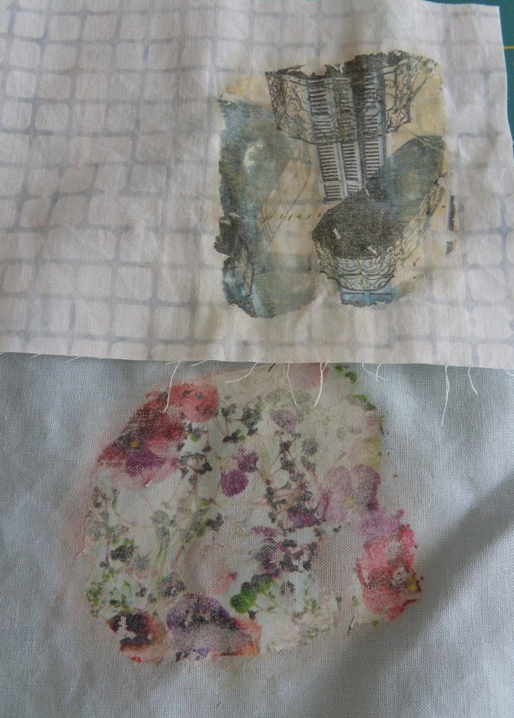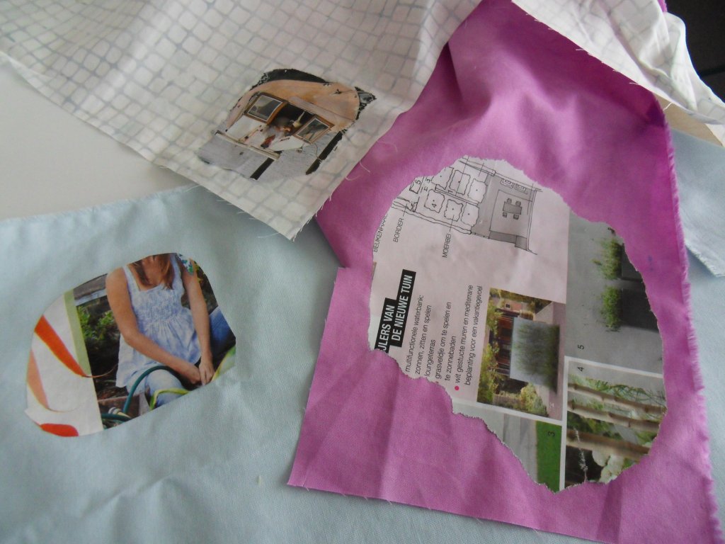 Ik had al op verschillende blogs gelezen over gel medium en toen ik dit in een winkel in Emmen zag heb ik het gelijk gekocht. Helaas vallen de resultaten me nog wat tegen, het is de bedoeling dat je afbeeldingen uit een tijdschrift o.i.d. overzet op stof. Daarvoor smeer je eerst de stof in met de gel en legt de natte afbeelding erop, goed aandrukken en dan laten drogen.