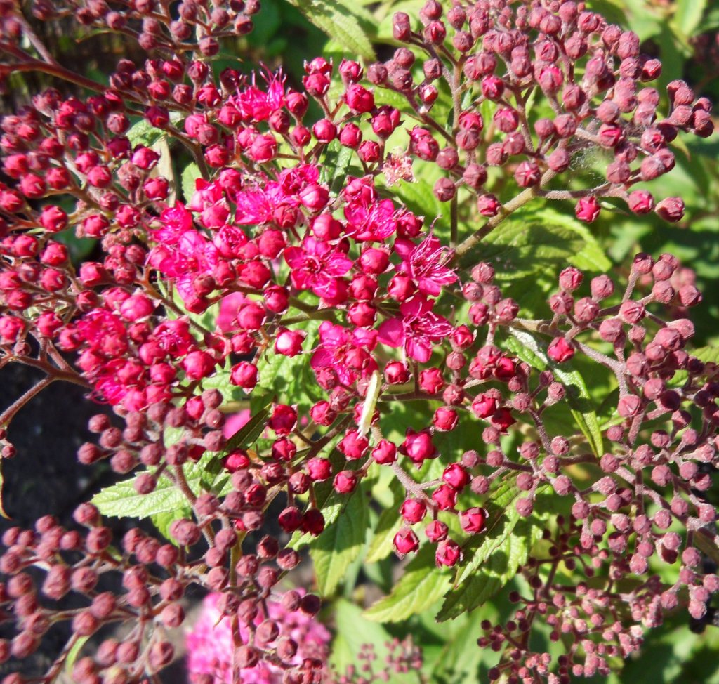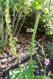 De spiraea “Anthony Waterer” doet het prima, evenals de lavendel en het eerste bloemetje van de geum is te zien. De verbascum bloeit in twee kleuren, geel en rose.