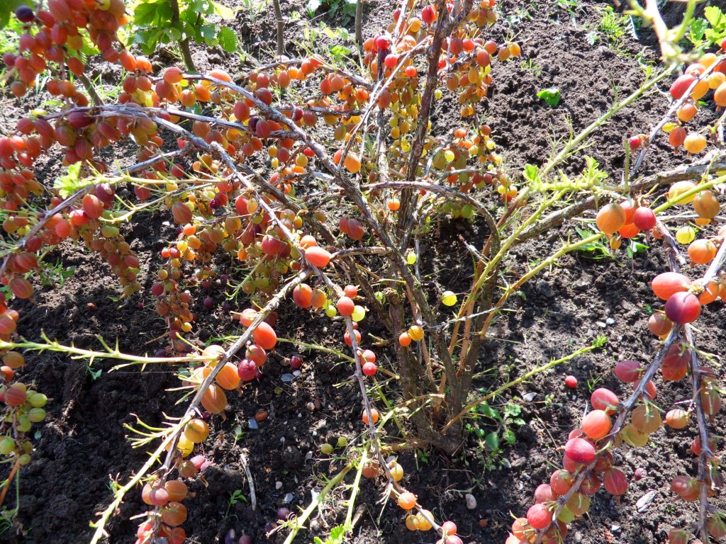 De blaadjes van de kruisbes zijn allemaal opgegeten, het is een raar gezicht, kale stengels vol bessen:
