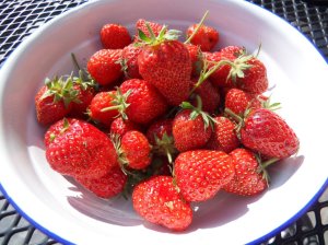 De eerste aardbeien zijn geoogst, ze smaken heerlijk zoet. Jammer dat ik ze zelf niet kan eten vanwege allergie, zelfs van het plukken had ik al jeukende uitslag op mijn armen.