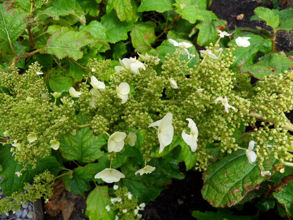 Na de regen van de afgelopen dagen lijkt alles dubbel zo hard te groeien in de tuin. De hortensia’s aan de zijkant doen het ook goed, dit is de Hydrangea quercifolia met mooie witte bloemen:
