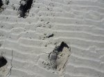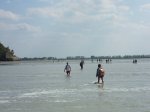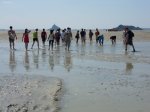 Je gaat dan onder begeleiding van een gids (in dit geval een superklein vrouwtje met een enorme rugzak), door de baai op blote voeten en in korte broek naar het eiland en daarna weer terug. Je loopt over zacht zand, hard zand, door modder, door water met af en toe flinke stroming, het was een ontzettend leuk avontuur. Overal zag je groepjes met gidsen lopen, we hadden twee uur voor de heentocht, konden ter plaatse 1 uur blijven en moesten dus ook weer twee uur teruglopen. Dat was helaas niet echt goed voor mijn achillespees, maar ik had het niet willen missen. Op de Mont zelf is het erg toeristisch, de parkeerterreinen staan vol met auto’s en bussen en je hoort allerlei verschillende talen, we zijn maar niet helemaal naar boven naar de Abdij geklommen, maar hebben lekker zitten uitrusten.
