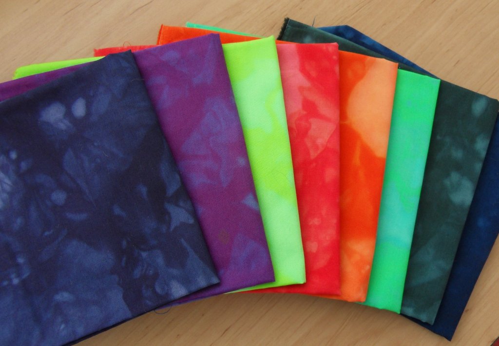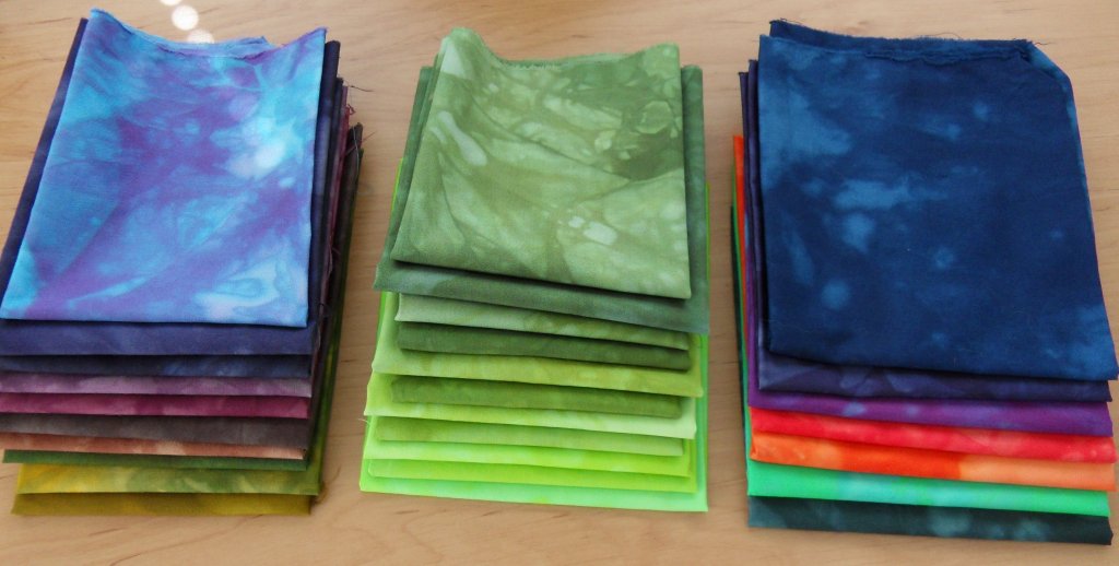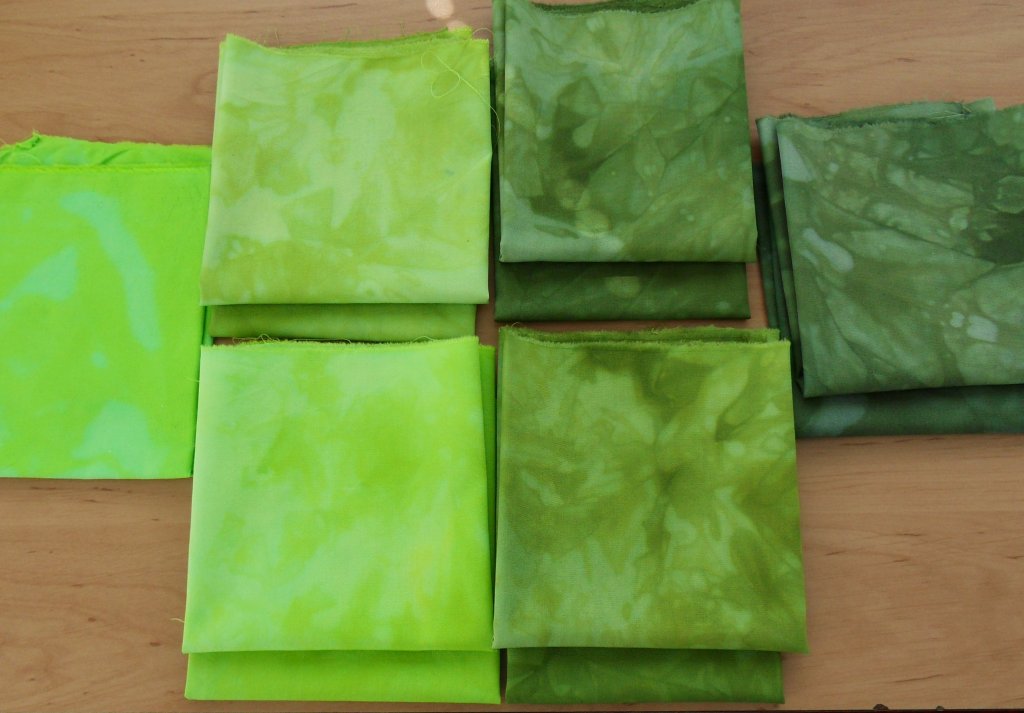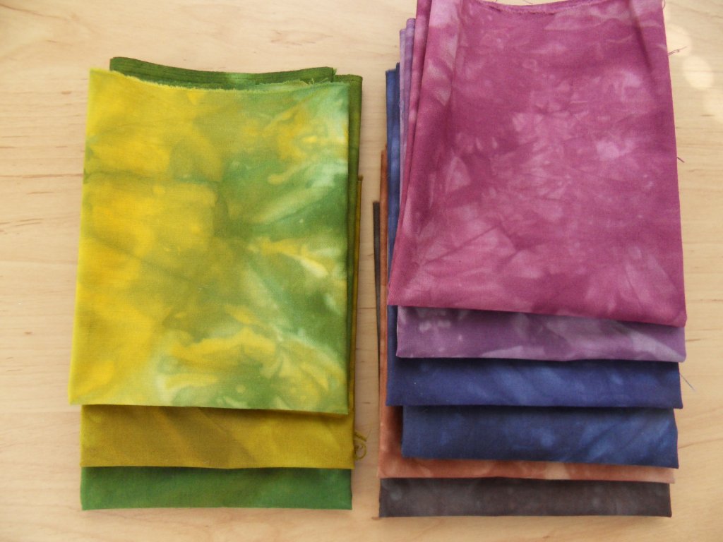 Woensdag op de verfdag heb ik zelf niet meegeverfd, maar gisteren kon ik het niet laten. Dit zijn de lapjes die ik van tevoren had geverfd als voorbeeld van de verfoplossingen die ik had meegebracht: