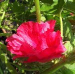 Vorige week zag ik alleen nog maar knoppen, maar nu zitten er prachtige bloemen aan de stokrozen. Ik vind het net crêpepapier, zo teer ziet het er uit.