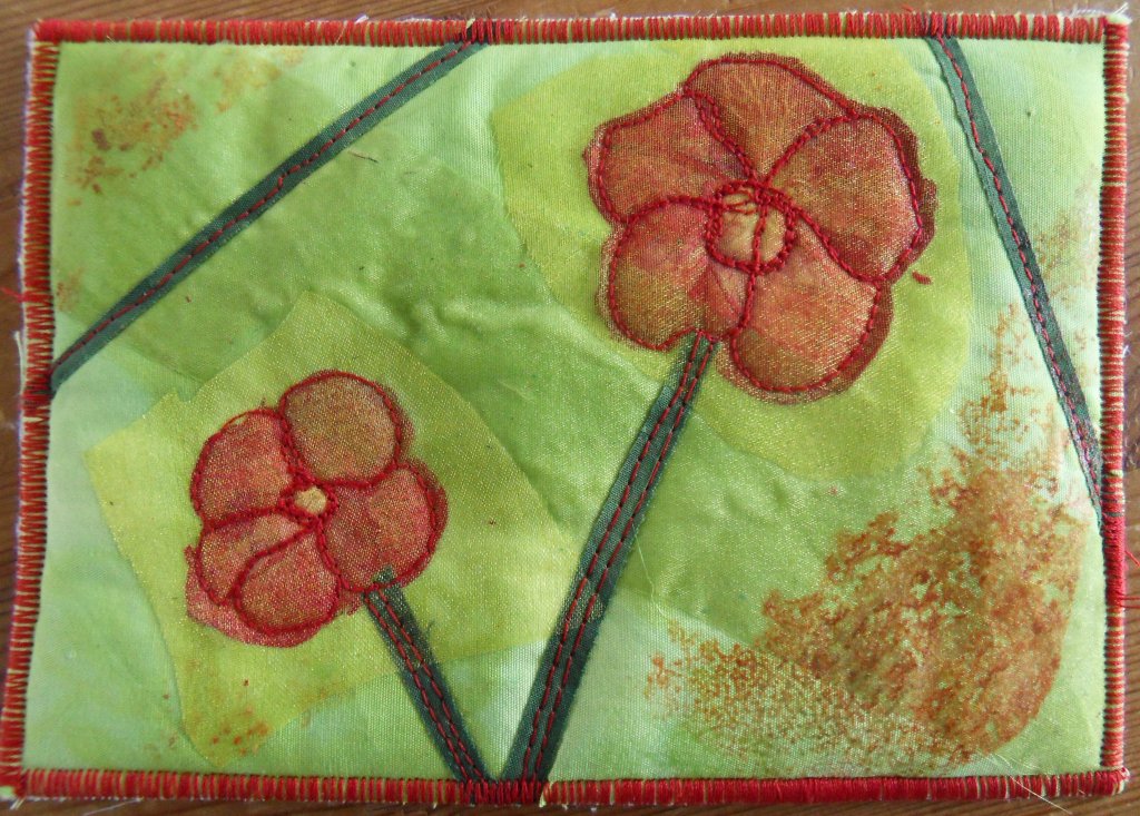 Voor deze kaart heb ik echte rozenblaadjes gebruikt. Ik heb ze eerst gedroogd tussen keukenpapier en met het strijkijzer, daarna gelijmd op de ondergrond en voile er overheen. Dit heb ik doorgestikt en hier en daar wat kleur aangebracht met geverfde vlisofix.