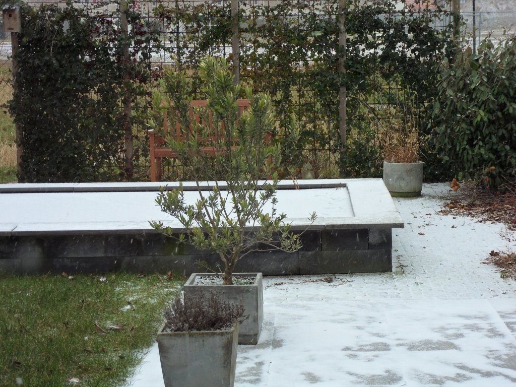 Het sneeuwt nu al even en de vijver en het terras worden al aardig wit.