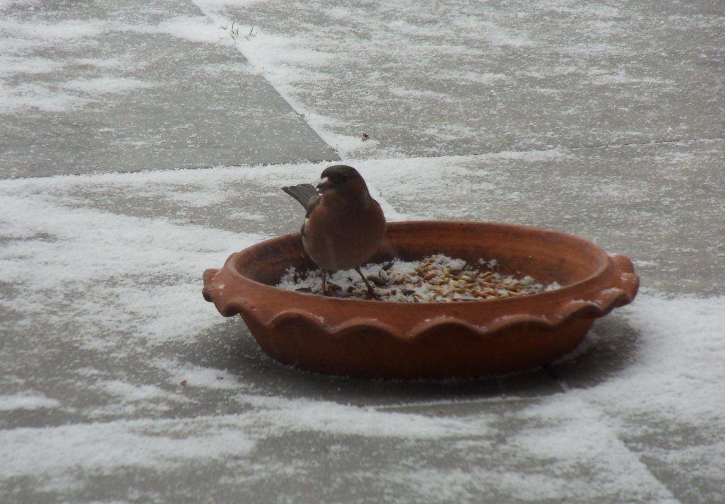 Nu het zo koud is komen er steeds meer vogels van het voer snoepen, de duiven gunnen elkaar niets en jagen elkaar weg, maar gelukkig kunnen de kleine vogeltjes er ook af en toe bij.