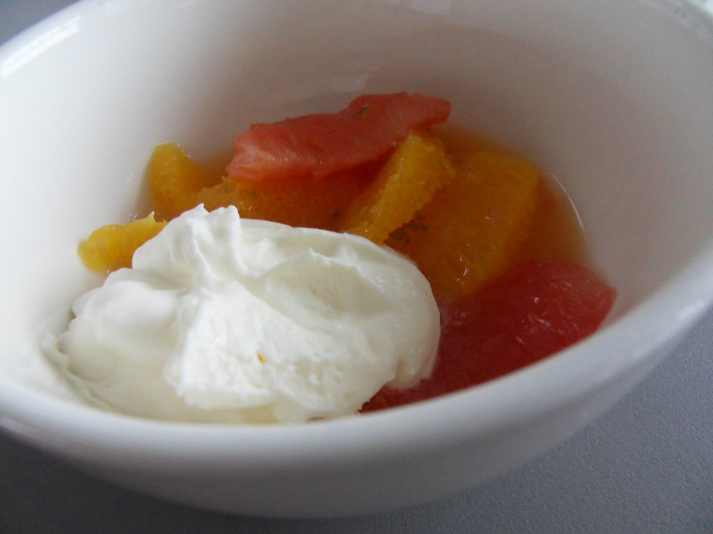 Voor 4 personen schil je 2 rode grapefruits en 4 sinaasappels, zorg dat er geen wit meer aan zit en snijd met een scherp mesje de partjes van tussen de vliesjes. Dit is een geduldwerkje dus heb ik dat maar door Aat laten doen. Rasp de schil van een limoentje en pers de limoen uit. Meng het sap en de geraspte schil met 3 eetlepels honing en 1,5 eetlepel warm water en giet dit over het fruit, laat dit een paar uur intrekken. Serveer met Griekse yoghurt gemengd met geklopte slagroom.