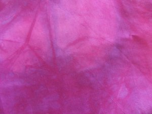 Ik wilde een lap in een bepaalde kleur verven en omdat ik tegenwoordig alles bijhoud in een “stalenboek” kon ik de kleur redelijk precies maken. De vorige keer had ik het met rose toermalijn en turquoise gedaan, maar helaas zag ik pas op het laatste moment dat de rose toermalijn op was, toen heb ik robijn gebruikt en de kleur komt aardig overeen met wat ik in mijn hoofd had. Ik heb eerst van beide kleuren een verfoplossing gemaakt en toen 32 ml robijn + 8 ml turquoise genomen, hierbij 400 ml warm water gevoegd en dit over een lap van 1 meter gegoten. Ik had de lap van tevoren in de soda geweekt, maar daarna laten drogen, ik had pas ergens gelezen dat de lap egaler wordt als je de verf op droge stof giet. Toen 4 uur in de rijstkoker en vandaag uitgespoeld. In de zon was de lap zo droog.