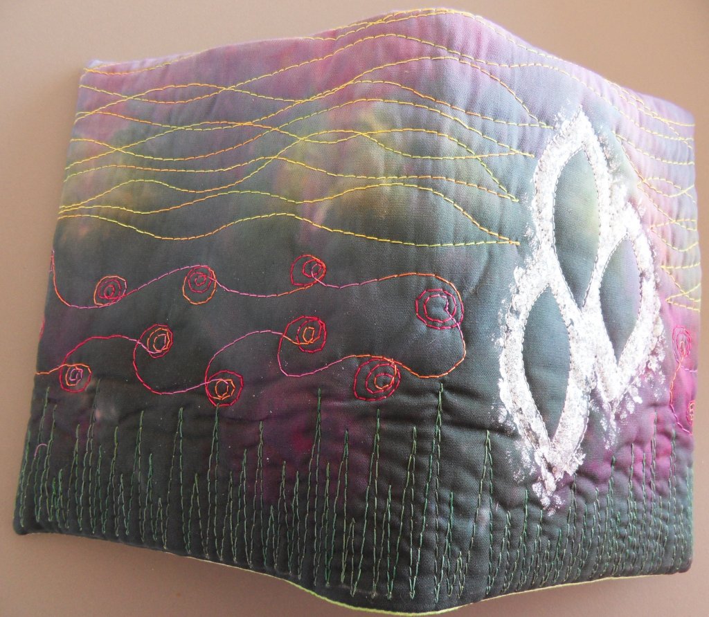 Daarna wat dunne vulling ertussen en een achterkantje en toen met verschillende quiltgarens doorgestikt.