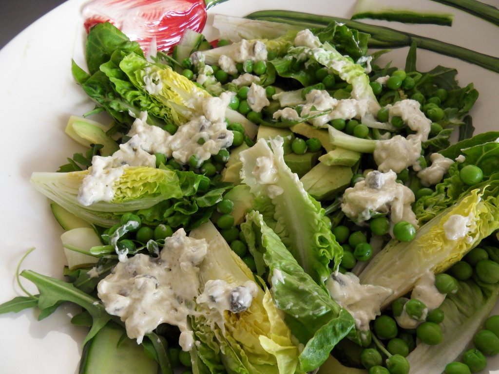 Het is naturlijk onzin om een bakje croutons te kopen, die maak je heel makkelijk zelf. Die van mij zijn wat donker omdat ik ze van heel donker brood heb gemaakt, maar je kan ook lichter brood nemen. Snijd wat boterhammen in kleine blokjes, hussel er wat olijfolie door en bak ze zo’n 20 minuten op een met bakpapier bekleedde bakplaat in de oven van 190° of in de koekenpan, maar bij ons stond de oven toch al aan. Daarna hadden we een groene salade met little gem, doperwtjes, courgette, komkommer, avocado en rucola met een dressing van crème fraiche, mosterd, fijngeprakte gorgonzola, kappertjes en olijfolie: