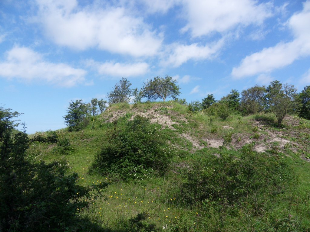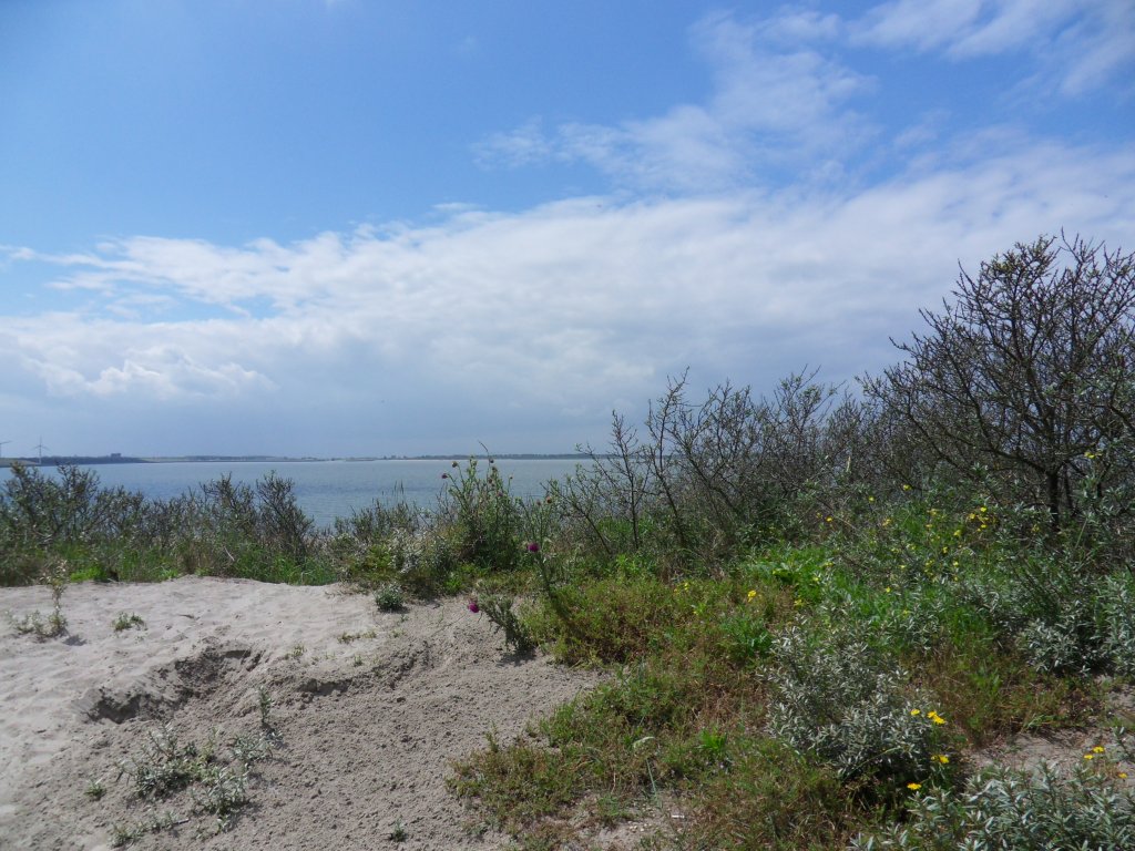We waren hier al heel vaak vlak langs gekomen maar waren er nog nooit gestopt. We zaten op het terras toen het begon te regenen zodat we even onder de parasol moesten schuilen maar even later was het weer droog en konden we weer verder. We hebben nog een paar regendruppels gehad, maar het viel reuze mee. Nog een stukje door de duinen