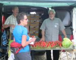 Bij één van de wagenrusten kreeg je volgens traditie een stuk watermeloen, heerlijk verfrissend! Een leuk gezicht, die mooie kleuren.