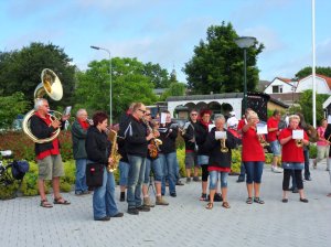 Daarna nog over het beruchte betonpad door de boomgaard waar ik twee jaar geleden bijna flauwgevallen ben van de hitte. Ook hier kregen we weer lekkere hapjes en toen was het nog maar een kleine 2 km naar de finish, waar we rond half 4 aankwamen. De muziek stond weer te spelen, ook onderweg zijn we hen een paar keer tegengekomen, hier staan ze bij 1 van de rustpunten te spelen.