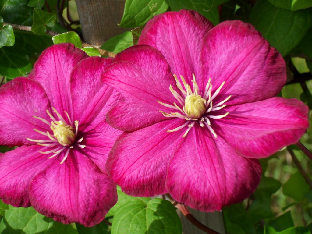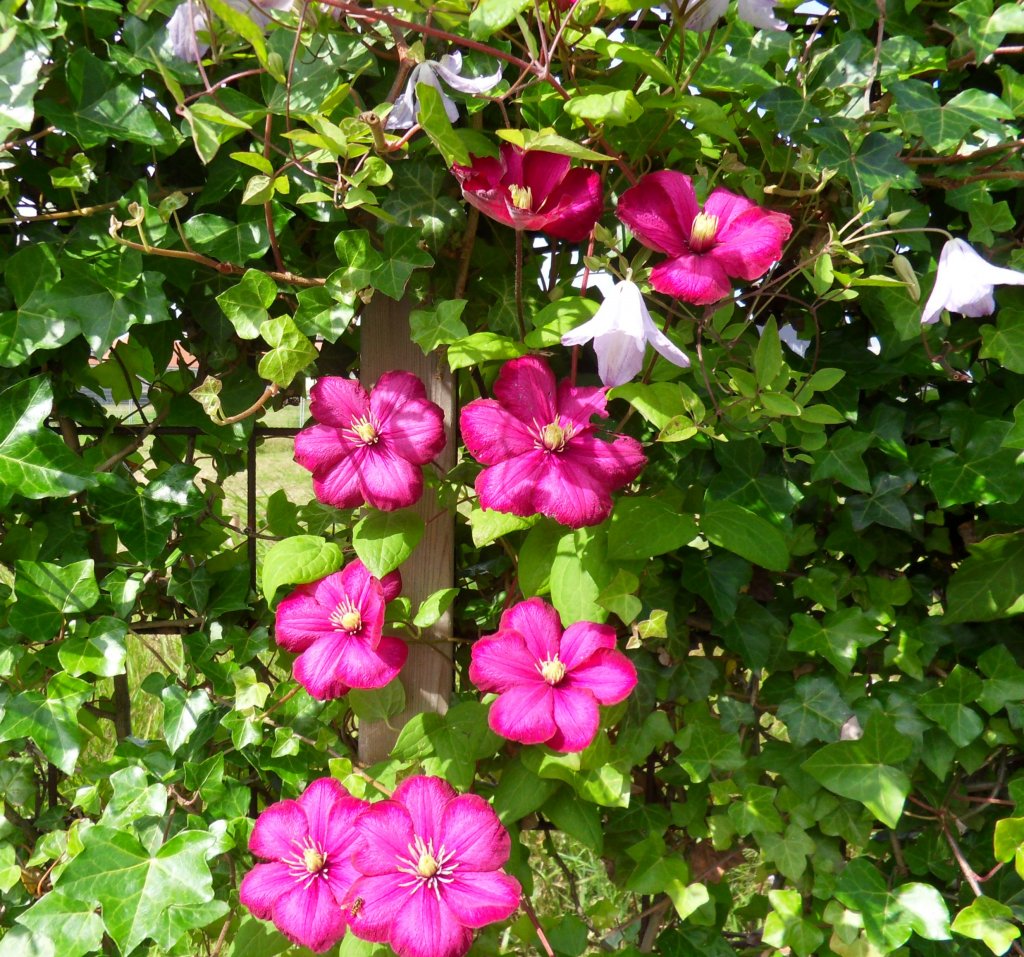 Het is een clematis “Ville de Lyon” met grote bloemen die mooi afsteken tegen de lichte bloemen van de clematis “Alba Luxurians”.