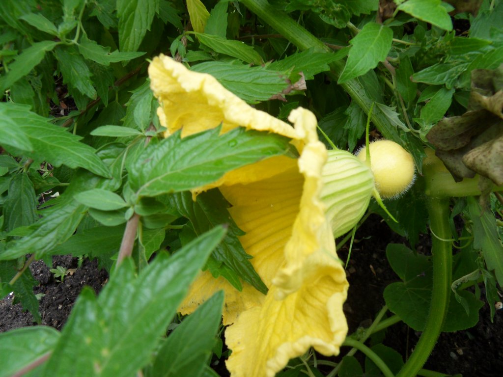De pompoen groeit ook lekker door, we hadden zelf zaadjes gedroogd en in het voorjaar in de grond gestopt, hopelijk komt er nog flink veel zon om ze groot genoeg te laten worden.
