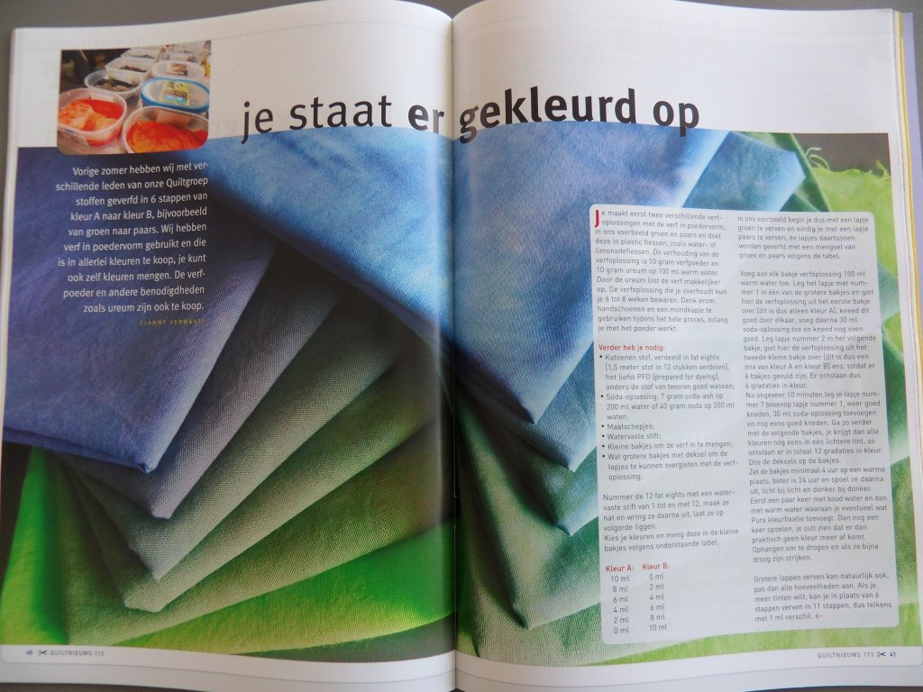 Vandaag kwam de nieuwe Quiltnieuws, deze keer staat er een artikeltje van mij in over stofverven. Naar aanleiding van onze verfdag vorig jaar had Erica, die onze quiltkring namens de redactie twee jaar lang volgt, gevraagd of ik dit wilde uitwerken voor het septembernummer. Ik hoop dat ik alles zo duidelijk mogelijk heb opgeschreven, mijn zus die nog nooit stoffen geverfd had heeft het eerst uitgeprobeerd en haar lukte het zonder problemen.