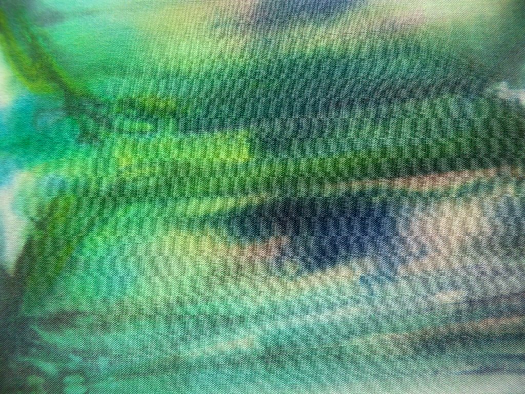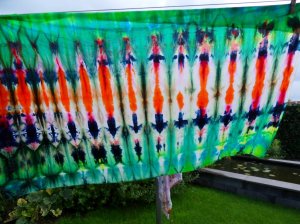 Ik heb een flinke lap harmonicagewijs gevouwen en in een afgedankte ovenschaal gelegd, waarin al een laagje soda-oplossing lag. Hierover heb ik allerlei restjes verfoplossing gegoten en de bak meer dan een dag buiten gezet. Vanmiddag heb ik de lap uitgespoeld en zo hing hij aan de lijn: